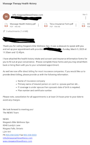 Ā Ā Ā Read moreThis place is absolutely wonderful. I know what Iām talking about as I go to this place almost weekly. Nancy and Leslie at front desk are amazing. They have a young new girl. I always forget to ask for her name, but sheās lovely. Denise is the beautiful lady that owns the place an always makes you feel welcome. She also set me up with very high quality compression stockings. Her decorating of her spa is impeccable. So relaxing and beautiful. Aga, what can I say. Sheās awesome she does my pedicures and manicures beautifully. I love Erin my RMT she is the bubbliest girl I know. Dr. Laura is an angel. A beautiful girl inside and out that has helped with my recovery of my injured arm. Along with Erin Iām on a quick road to recovery. Andrea gives amazing facial makes you feel wonderful. All the girls are awesome and friendly. They can process your insurance electronically which is an added bonus. I love this place and will continue to come here as all my family also enjoys their services. Keep up the...