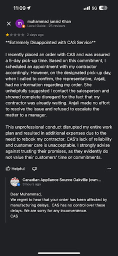 Read moreMy first experience back in 2021 with CAS at the Oakville location was the purchase of a washer and dryer and the entire experience was effortless. As a result of the positive experience, this year I purchased a new refrigerator and the salesman Derek was again great to deal with. However, the after sale experience has been horrible! My refrigerator was delivered Feb 1st only to find that I was missing parts and the tools to properly level and align the doors. I contacted CAS and was told I had to contact the manufacturer LG. This in itself was frustrating as I purchased my refrigerator from CAS not LG. However, as instructed, I contacted LG and despite my efforts in referencing the sales manual to the parts and tools I was missing, they sent me the wrong parts not just once, but twice! I reached out to CAS to notify them of my frustrations and advised them of LG's complete incompetence! I have been expecting CAS to rectify the situation, but they have done nothing and they have never tried to contact me to follow up. So here I am almost 4 moths later and I still have a refrigerator that I can't properly level, or align the doors! After all the problems that I have had, and my continued frustrations, all CAS had to do was send someone to my house to preform the proper adjustments. It would have taken them all of 20 minutes with the right tools and parts. However, CAS has decided to just ignore the situation. I told Derek weeks ago that I would hold off writing a review in hopes that they would address my concerns. However, my patience has worn thin...