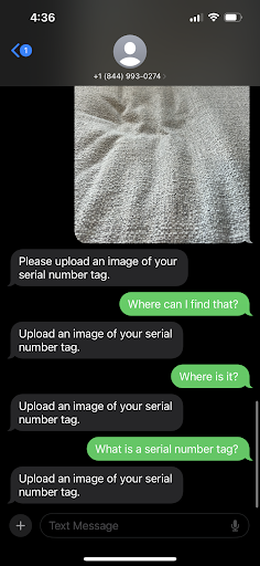 Anyway, we go home after Manpreet shoo’d us out of the store, and we text the mighty robot Eva. She asks for our serial number tag, and when I ask Eva where I can find that, she just keeps repeating herself (screenshot included). So now I’m at a dead end.