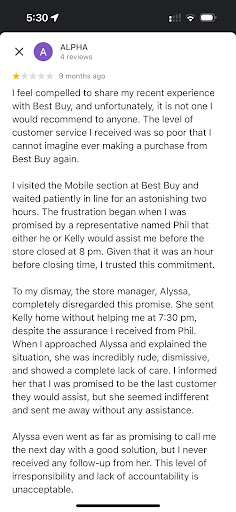 Read moreI've bought numerous products from this location, minimal wait times and mostly positive experience when dealing with staff members. I don't go in with a blind eye on any product that I buy so I don't put it on the staff to try to sell me or persuade my decision on any product I purchase. Here's where it get's negative, I went in to purchase a laptop recently and the model was sold out but they had an open box. I asked the staff member if anything was wrong with it and she said " no, the customer just had buyers remorse". It was discounted appropriately, and was told that I would be receive 6 months of geek squad for free (meaning the price of the product will be discounted for the 6 months). I was fine with this and thought it would be a smart move to get it on a open box product. She removed all the stickers on the unit and placed it into a box for me as I didn't want to carry it out bare, shame on me for not looking at the laptop itself as the buyers remorse was clearly a load of crap. The unit had been dropped or was thrown around. I couldn't see the damage because the stickers were placed over top of the unit (open box sticker and price code). I brought the unit back in and was told that I could have a full refund or money off as the unit will not be sold again at Bestbuy. I took more money off which was great. I figured this week that I probably won't need the geek squad membership any more as the cost of the laptop was so low now that I can probably replace it for less if it breaks and the replacement cost cheque they give you would be the same amount I would have paid for the unit, again not enough to buy a laptop. When I call to cancel the membership I am told that I have to pay a cancellation fee. I explained that I was told after the first month I would NOT have to pay a cancellation fee otherwise I wouldn't have taken the service and I was instructed to contact my local Bestbuy again. I get the staff is driven to make sales, but don't flat out lie to people. This is one of the reasons I will continue to...