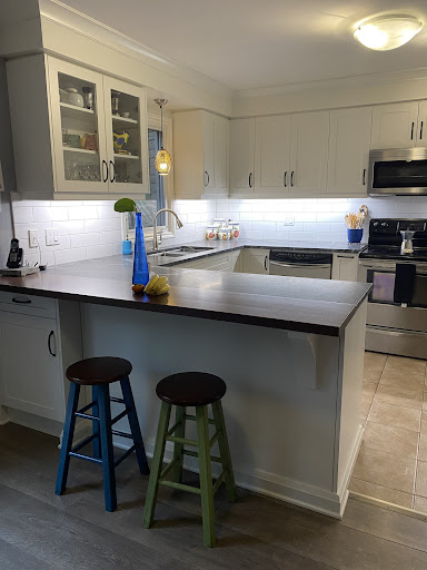 It took me a few years to settle on who would be taking on our kitchen renovation, and the pandemic meant two things: major delays and considerable increases to costs. The LCK team made the process bearable, and the price was UNBEATABLE. That meant we were able to do two major upgrades - granite counter, and counter height butcher block with peninsula seating... and we also added the OTR microwave, massive pull-out pantry, spice rack, and garbage bin. The end result is really...