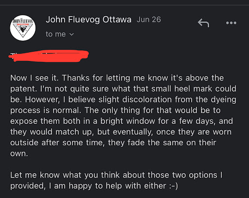 Read morePurchased a pair of shoes online and they came from the Ottawa Store. They were scuffed, had skin/sweat marks, and were discoloured. I was told that if I were to put the shoes in direct sunlight for a few days that the colour would “match up”. I don’t think it is appropriate that I have to risk the integrity of the shoes and damage them further. The damage on the heel was apparently made by “the handmade tools used to wrap the leather around the heel unit”. If something is handmade, there should be more attention to detail.