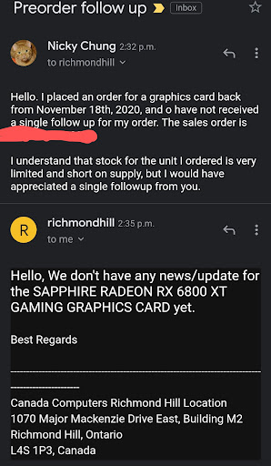 This review applies for ALL Canada Computers, not just the Richmond Hill location. Let me begin by saying that I did my research on the creation of this company and it was created in 1991 by a Gordon Chan. That being said, it is now 2020 and it seems as of their systems haven't changed since day 1. For a place that sells technology and computer parts, you would think they would have better tech and systems. This entire company should consider themselves lucky they have an advantage in exclusivity with their parts and that it is almost impossible to get certain parts somewhere else because that is the ONE AND ONLY reason anyone would ever shop here. The staff are mediocre. No complaints specifically regarding them, but nothing exemplary either. Their customer service is average. You may get lucky with some and unlucky with others just like other businesses. However, this pandemic is a sign of how well a company can perform, and Canada Computers has performed TERRIBLY during this time. They have set up a little make-shift doorway for you to line up outside in -10 or colder weather while they have 1 person taking your order number, 1 runner, and 1 other person doing God knows what. You would think in today's day and age you can set up a more sophisticated method and have customers wait in their vehicle while you use an electronic method to verify curb-side pick up. At the VERY LEAST, have the employee who is doing NOTHING, to go outside and collect the waiting customers order number so your runner can prepare more than one at a time. This is not a track marathon for your runner to repeatedly go back and forth picking up one order at a time. Quite honestly, it would be common sense for you to collect order numbers from all customers waiting, tell them to go wait in the car, and text them when their order is ready for pick up. It is honestly a pathetic business and I can not wait for some entrepreneur to wipe them off the face of the Earth. This is only their retail side. Their online services are laughable as well. They text you to come pick up your order within 3 days, but if you don't come within 2 days they will cancel your order. Any inquiry will take them over 1-2 weeks to reply. At that point there is no reason to even start an inquiry. On top of all this, their return policy is absolute garbage, and any issues with the parts need to be handled by the company which manufactures the part. This makes sense, but they operate as if it is a Pacific Mall business where they only take cash and anything you buy is final sale. I'm 99% sure if they could, they would require everyone to pay cash so that they can evade taxes.