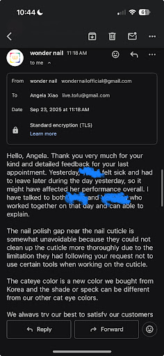 And then, through the whole process, I have said āthank youā many times, you couldnāt even hear once. And I told you I want the SAME color as the rest of the nail. It turns out itās not the same color and Iām pretty sure I picked the same one last time. If you want I can post both previous and before do you can compare. You keep emphasizing that fixing the nail is free, to be honest, I really should have just ask you to remove the whole thing cause what you did was not what I original expected. I have been to different nail places, and itās the first time this happened to me. Anywhere else, if the nails cracked or broken, they will fix it without saying a word. Iām mad not because of my nature nail broken, but the service I received and the attitude the stuff threw on me. If you could explain everything gently and clearly, I wouldnāt want to spend my day off typing this review.