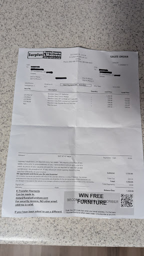 Read moreI recently Bought some furniture st.catharines location I purchased a mattress in king that I was told was memory foam but wasn't I had to go buy memory foam after to make the bed comfortable enough to sleep on. I bought a bedroom set for my daughter which she loves so far but when I was unpacking the set after it was delivered I couldn't find a mirror for the dresser not realizing that the mirror for the dresser needed to be bought separate when I called about it the salesman Jesse had told me he would be happy to add it to my bill, I had financed so was told I could add to it for a certain period of time after the sale. I went into the store to add the mirror. That's when the salesman Jesse told me that I would would have to purchase a minimum of 3 or $400 more items of furniture. Lol what a joke. I'll take my business to Leon's or the brick for anymore purchases they also deliver for free. Surplus makes you pay 60 cash for delivery. Bad business they lost me for any future deals. They also lost not only my business but I've told family and...