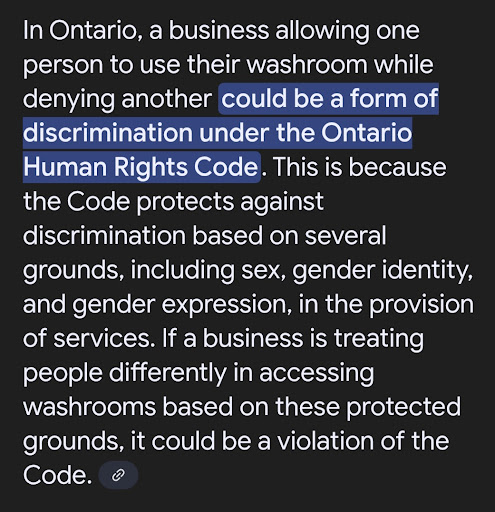 Update. Response to your reply. The washroom was accessible to some customers but i was not permitted, that is when it became a discrimination issue. I was discriminated. It was hurtful. The washroom rule should apply to all customers and not exclude one. That is discrimination and again hurtful. If you took the time to read and understand my post i was understanding that the washroom was private and willing to find another restroom i just wasnt expected to be...