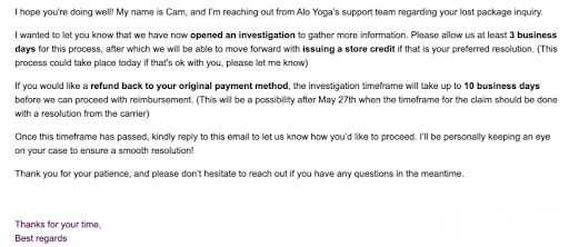 Iāve had the worst experience with ALOās customer service. I never received my order, and every time I reached out, I got the same generic response: āWeāll look into it, please allow 7ā10 business days.ā This went on for nearly two months with no resolution.