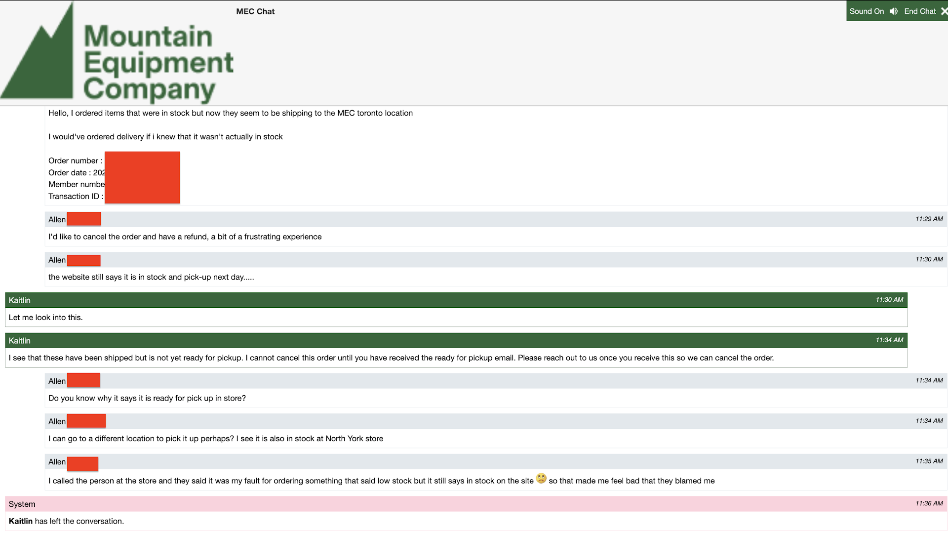 In all of this, not once did anyone apologize for having not fulfilled the store pickup order in the first place, or even seem remotely surprised, or ask each other / anyone what happened. If you decide not to fill an order because you'd rather hold onto your limited stock and push a customer pickup to the next week that's bad enough. But not having the ability or will to put in a little effort to try and fix it in the system or by doing the calling, or even caring enough to apologize, is a whole other level. I didn't make much of a fuss through all of this but I can't imagine I'll be shopping at MEC again if dealing with customers who want to buy things is...