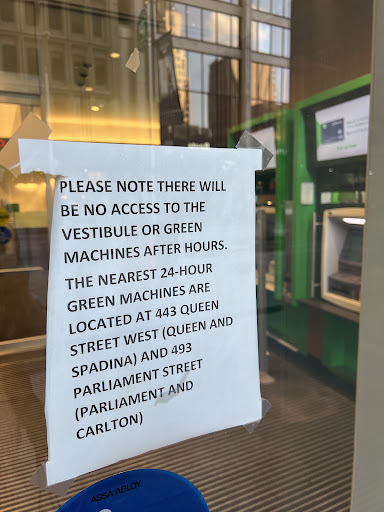 According to Wikipedia, āBloor Street is a major eastāwest residential and commercial thoroughfare in Toronto, Ontario, Canada.ā If the ATM at Bloor and Yonge is out of service and the ATMs at Bloor and Bay to the west and at Bloor and Sherbourne to the east are both closed after hours, then how is the Toronto Dominion bank servicing its Toronto customers on this major Toronto street near the major cross streets of Yonge and Bay? Residential real estate listings in Toronto boast of locations "steps to Bloor-Danforth Subway", yet what is there to boast about for TD customers on Bloor Street if their Green Machine ATMs at Yonge and to the east (Sherbourne) and west (Bay Street) are either locked after hours or out of service? This dense commercial/residential stretch of Bloor Street has become a dead zone for Green Machine after hours access. Why?