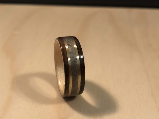 My first wedding band was a rose gold plated ring with a wooden inlay. The rose gold tarnished within a year so pay attention to rings being plated v. solid. I did not care since the ring was purposely cheap due to working as a restaurant chef during that time. This ring by Northwood has not tarnished since it is solid gold and would...