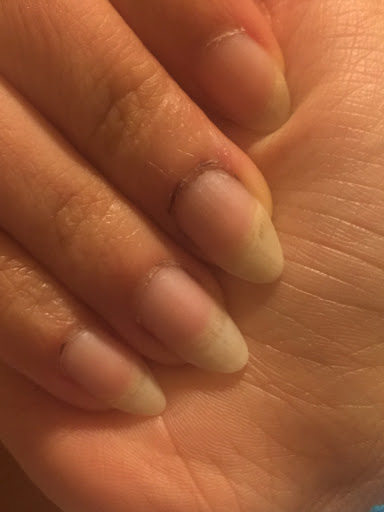 One of my nails have lifted and it was painful so was prepared to endure a little bit of pain. I will say I did leave my nails for 4 weeks as I know I shouldn't have! Anyways this girl is Iranian and has a (DRY) sense of humuor as she had stated that she is not like the 'typical nail tech' and speaks English - if u catch my drift.. She was on the phone the whole time talking to her mom and cut me while answering on the corner of my left thumbnail. BUT what hurt the most (and I am very upset with myself for doing this) My left hand ring finger had the terrible lift and we needed to take it off. She had buffed it down halfway and started to take a dull tool to lift it off. It hurt so bad... I literally took her little small cutter to cut most of the lifted nail off. She gave me her dull tool and told me to rip it off myself. She said she would rather me do it so I wouldn't get mad at her. I have never had to rip a nail myself - off and deep down inside I knew what would happen. It is my fault for listening to her - but I did. I took the dull tool and quickly tried to scrape the remainder of the nail off. (So ya - little my fault as I am new to this nail thing) My whole nail bed came off F* it hurt so bad I felt like I was going to pass out. Nearly did. She was rude the remainder of the time my girlfriend had gotten a predicure and came up just after.. she also had said (via txt) she was very rude to me. Went downstairs whispering to the receptionist giving dirty looks. I asked her how long it would take to heal, as she said dismissively 2 Months. Um, ok. I was thinking Thanks B* She even offered me adavan??!!