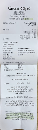 Read moreI really love Great Clips on Davie Street in the West End, Vancouver. For the past few years, I regularly see a highly trained hairdresser, her name is Nahid. Nahid is not only an excellent hairdresser, she is also a wonderful and friendly, kind person. Nahid is a professional with a lovely personality, always welcoming and encouraging. And she cuts my hair perfectly. I have hair that is thick, curly and grey. I don't colour my hair, I prefer to honour my natural colour and Nahid gives me a beautiful haircut every time consistently. Also she doesn't try to get rid of my natural hair quality by thinning my hair like other hairdressers have done in the past-- she loves my thick curly grey hair which she cuts patiently with scissors and does not try to thin my hair with a razor. I have never had a better haircut in my life. Every single time, my haircut is perfect. I am happy!...
