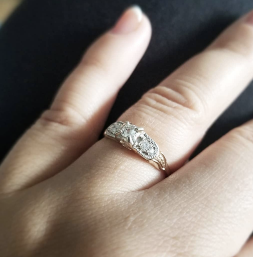 I came in several times: to look at and approve the rubber mold/cast thing, which they redid when they (not me) found a small imperfection. They were also helpful in recommending design features to enhance the vintage character that were not present on the original ring (milgrain), while being completely respectful of and invested in my (very old-fashioned and possibly not the most creatively stimulating) vision. They also explained the entire process and structure of the ring very clearly so I felt like I knew exactly what I was getting. I really learned a lot about jewellery!