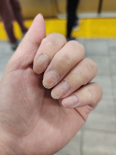 It was awkward as heck sitting there while she removed everything. AND she overfiled my pinky with the e-file. I said OW and told her she filed too much. She didn't say sorry. Then I left. I wasted 75 minutes of my life, went home with THIN SHORT NAILS THAT WERE ROUND (NOT SQUOVAL). I stopped doing my nails for a long time so they were quite strong. Not anymore. My nails were so thin and sensitive after she overfiled them. The next day I gave myself a gel manicure, which makes my my nails thicker and a bit stronger. The following days I still broke so many nails because they were so brittle from her overfiling.