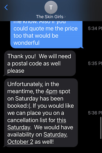 Read moreI have never written a Google review before, however, just with the entire situation I thought it would be effective to write one. I recently had a disappointing experience with the Skin Girls. This was my first time booking with the Skin Girls and I was really excited as I had just moved to Vancouver and I was really looking forward to see how their services are. The booking was easy and the lady on the phone was an absolute gem and super informative. I had looked at the reviews and everyone had left amazing reviews. However, yesterday (Lower Mainlandâs first snow fall and the crazy traffic) I had called in at 3:00 expressing my concerns with the weather and stating that I was coming from Surrey (after work) and the roads seemed to be a challenge to drive in. Additionally, I had acknowledged I know there is a $105 charge for a âno showâ or cancellation within the 24 hours window (which I totally understand from a business perspective); thus I asked if I could get an earlier appointment - in hopes to beat traffic. However, the gentleman on the phone stated that they were booked up until my appointment time and if I cancelled the system would automatically charge. I tried to leave work early to make it in time (3:30 pm) the gps was showing me 2 hours to get there (usually it only takes an hour), which would mean I would make it possibly right on time for my 5:30 appointment. The time kept increasing and the road conditions were bad, I had my husband call and let the gentleman know I would not be able to make it and asked if there were any exceptions to the $105 charge and he was informed that there was not as so many cancellations were happening and that other people had made it out from Surrey and the charge is applied due to the appointments being booked in advance and not being able to take other clients, my husband was definitely frustrated with the answer. I understand that the charges are required for âno showsâ or last minute cancellations and had I have cancelled for my own reasons I would understand and would not be frustrated with the $105 charge. I would have loved to get my services as I am sure they might be great based on their reviews, however, I believe there should some exceptions made with severe weather conditions. The lack of empathy and understanding for the circumstances left me quite dissatisfied. Customer service should prioritize flexibility in such situations.