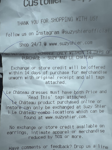Okay, sure, we will shop online. Temu, Shein, Venus all have great customer service compared to this manager so we will go to Suzy Shier again, we will NEVER WASTE OUR TIME AT YOUR...