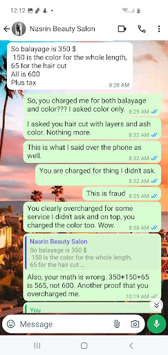 To make matters worse, less than a week later, the bleach started fading, and my hair looked dreadful. I reached out to Nasrin, expressing my frustration and disappointment. I asked her to fix it as I wanted the full hair done and the color I originally requested. I was so upset that I couldn't stop crying. She reluctantly offered me an appointment on Saturday at 2 PM, but when the day arrived, she kept telling me she was too busy and needed to postpone.