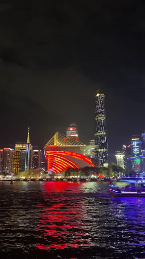 Bên ngoài thuyền, sáng đèn hắt lên từ hai bên, thứ ánh sáng khiến sông Châu Giang càng trở nên lung linh, huyền bí. Tiếp theo là những chùm ánh sáng rực rỡ từ những tòa nhà cao tầng dọc hai bên bờ sông. Một khung cảnh tuyệt vời, tráng lệ đã bắt đầu lộ diện. Những cung điện trong câu chuyện cổ tích đang dần hiện ra ngay trước mắt chúng mình. Mình cứ như người bị nhốt trong một ngôi nhà nhỏ, một không gian chật hẹp, tù túng và đang cố vươn ra nắm bắt lấy vẻ đẹp bí ẩn rộng lớn bên ngoài kia.