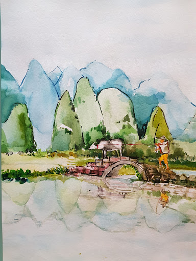 A watercolour painting of mountains at the background reflective on the river streams is as shown, artistic impression based on a taken photo. I hope my watercolour painting of this place is acceptable/at least quite same as the actual scene. But just visit this place and you will know what it means to be in a picture.