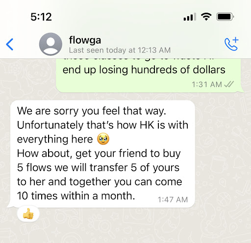 I’m a student who has a passion for hot yoga. I found flowga after trial and error in hong kong of looking for a proper hot yoga place. The classes are so unbelievably expensive compared to the rates back at home but since this is a passion of mine, i waited til black friday to purchase a package with Flowga. My new years resolution was to go to 2 classes a week and I was excited and ready. I lived over an hour away and getting to the classes when i worked full time was tricky but i still really tried when i could. When boom the unimaginable happened and I lost my job in Hong Kong. I had to go back to the United States out of nowhere and I couldn’t finish my package as now I only had a month and a half to get the most out of Hong Kong. I wrote this company explaining my situation. I understand a no refund policy, but have a little humanity. I lost my job and I’m a student. I’ll attach the response i received after explaining my situation. I lost around $350usd (about $2800hkd) to Flowga after I lost my job and I’m still taking online classes. I asked if the classes could at least be transferred so they wouldn’t be wasted. Well they’re being wasted and I can’t be there to do anything about it. These classes aren’t worth the money in my opinion. I hope the instructors at least get paid well.