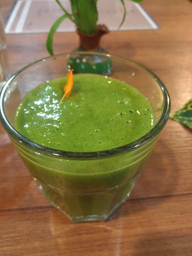 The smoothie this day was banana, spinach, pineapple. Very hearty, not super cold or frozen, great consistency. It had to be one of the best ones I've had till date and looked super too. It was garnished with a blue butterfly pea flower leaf.