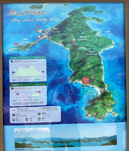 There is a nice trail between Kiu Tsui and Hap Mun that is around 1.6 km in distance. The trail crosses from north to south, covering attractive island landscape, climbing to an elevation of around 135 metres above sea level. What makes the trail nice is that it follows a ridge much of the way, providing views of the coastline, the sea as well as other outlying islands on both sides of Sharp Island. When sky conditions are favourable, the views are really nice in both directions.