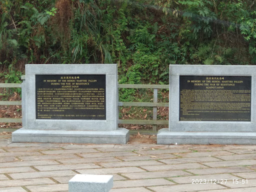 What you'll find is an arched gate structure, a simple cenotaph memorial, inscribed with Chinese characters and the red star. Within the garden grounds, there are two plaques with information in Chinese and English describing the monument as tribute to the guerrilla soldiers and village martyrs who died while resisting the Japanese occupants during WWII.