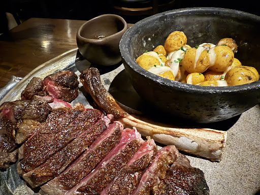 Next came the steak; we ordered a 650gm bone-in dry aged rib eye to share. This was almost $100 US, but it was worth it as everything else was so reasonable. We ordered the baby local potatoes, which came with a steak sauce we never touched. As part of the experience, the server will present you with a decorative box they open with fanfare so you can choose your steak knife. There are at least 10 in a box, and they are from around the world. All are sharp, and each is more unique than the next. My wife chose a Japanese knife with a handle shaped like a Narwhale, and I decided on a rustic French knife with a horn handle.