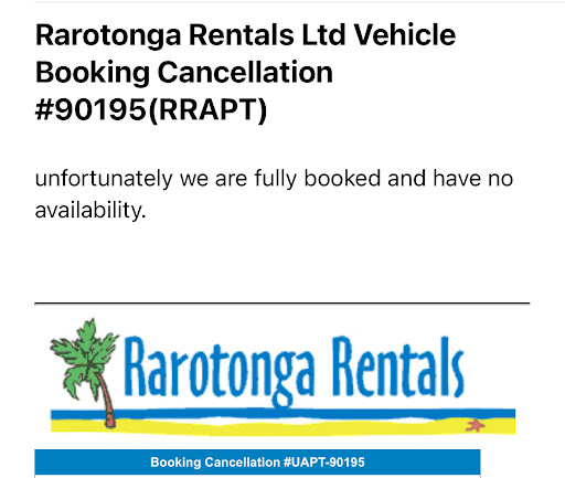 On arrival, our rental car was not where the email had detailed it would be left . I then called "Island Car and Bike Hire" was told a car was not allocated and to make my way to their facility. In the meantime, I enquired with "Rarotongan car rentals" who own "Island car and bike hire" . Was told by a younger female in the office " Sorry your booking was cancelled. we over booked the cars , so just walk around and just ask the other companies for a rental ". I did not receive a cancellation and if I did I wouldv organised alternatives . Not only that but they still took payment too, not only did I have to find a new hire car but also costed me more as the refund takes 3-5 buinsess days .