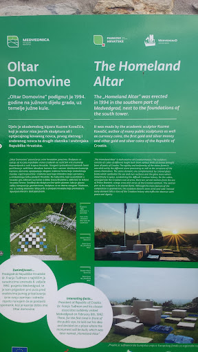 Read moreOltar hrvatske domovine izgrađen je u sklopu projekta "Obnova Medvedgrada u čast hrvatske slobode", koji je za svoga posjeta Medvedgradu 1992. inicirao predsjednik Republike Hrvatske dr. Franjo Tuđman. Oblikovanje Memorijalnog obilježja u čast hrvatske Slobode u sklopu je cjeline posla na burgu, ali je zaseban autorski posao, koji je povjeren kiparu Kuzmi Kovačiću, čiji je prijedlog, na pozivnom natječaju (1993) odabran za realizaciju. Kamen je osnovni materijal iz kojeg je izgrađen spomenik u klesarskoj radionici Božidara Radovana od 15. siječnja do 30. travnja 1994. Odabrano je deset vrsta kamena (simbolički iz svih hrvatskih krajeva). U realizaciji spomenika sudjelovali su i drugi suradnici, svatko prema svojoj struci. Pino Signoretto, vlasnik i majstor ljevač stakla u Muranu kraj Venecije, lijevao je, zajedno s kiparom Kovačićem, velike staklene kocke ili "ploče mora". Sam čin svečanoga otvorenja spomenika zbio se 30. svibnja 1994. u 10 sati. (Izvor: Bešlić, Milan, ; Kovačić, Kuzma, "OLTAR HRVATSKE DOMOVINE", Stoljeća d.o.o. ,...