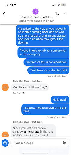 (This review will be a long and thorough review of my boat tour excursion.) However, if anyone wants a first- hand real experience description, here you are. I am writing this review with the hopes of others choosing this boat tour and having as great an experience as my husband and I had. We took a trip to Split, Croatia in July for my birthday. We had such a great time and wanted to plan an excursion, so we spoke with our hotel and planned this boat trip with @hellobluecave. The weather was great the first days of our 9-day trip but the last few days, there were thunderstorms and rain. We booked this boat excursion for the last day of our vacation in Split with the hope that the weather would improve. On the day of the trip, the rain and lightening/ thunder had stopped so we were excited for the boat trip. We arrived at the boat launch stall located at City Center in the morning. Our boat captain arrived and checked in the group who would be in the boat. The group included my husband and I and another family, and three others. The captain was courteous with the check-in process for all of us. After boarding the boat and leaving the dock, we were informed that due to the weather from the previous days, the captain was awaiting word whether it would be safe to go to the blue cave which was one of the highlights of the tour. After travelling by boat to the first destination of the trip, the captain was advised that we would not be able to include the blue cave destination due to the high waves from the previous days’ storms. Understanding our possible disappointment, the captain insured us that he didn’t want us to feel that our experience was lacking. As a result of the itinerary having to change, the captain made up for it by including two additional stops at beautiful swimming locations where we were able to get off the boat and swim and enjoy the scenery. We visited the major islands as well as the two additional hidden gem locations for swimming. The captain also extended the length of the boat excursion to make up for the unavoidable itinerary change. Due to the weather, we did experience some pretty choppy waves at times, but I personally found that fun. Also, the captain’s first mate, Sara, was such an excellent host. She was so kind and personable and explained everything to us. While travelling between locations, she played excellent music on the boat that perfectly fit the mood of the experience. So much so that I had to ask for the playlist. This is a long review but I’m sharing my experience because I want others to have a great experience as well. Both my husband and I agree that this boat tour was the highlight of our trip to Split and are so happy that we included it in our trip. There are many excursions from Split, however I can personally recommend this one from the great time that we had. You can find this particular boat tour from their Instagram which is @hellobluecave. That’s where I contacted them to thank them after the trip. I hope this helps anyone looking for an excursion that has proven to be...