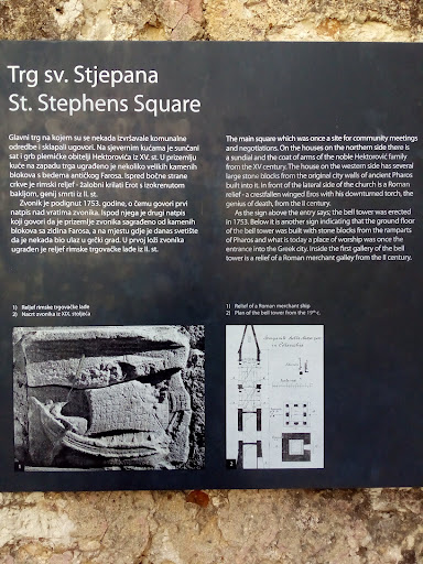 The Church of Saint Stephen is a Baroque church. Its construction began in 1604, where in the 12th century, the first cathedral of Hvar was located. The church houses the triptych by F. De Santacroce (1516-1584) and the black marble altar of Santa Croce by A. Bruttapelle from 1773, while the bell tower, separate from the church, dates back to the 18th century. The ground floor of the bell tower was built with stones from the walls of the Lighthouse and, ''where once was the entrance to the city, now there is the entrance to the bell tower'' (Written in Latin, at the entrance). The bell tower is also carved with a relief of a...