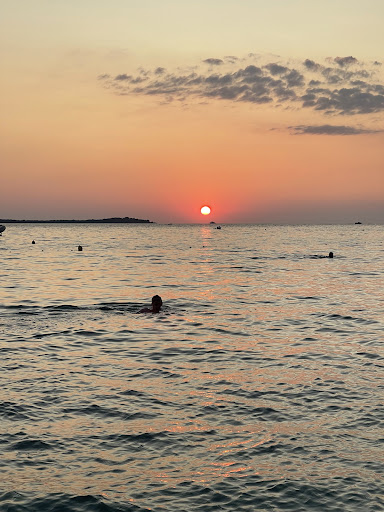 Am Beach gibt es verschiedene Entertainment Möglichkeiten. Liegestuhlverleihung, zwei mit Schirm für 20€ am Tag. Es gibt eine Hundestrand, das Wasser da ist schon sehr schmutzig. Aus irgendwelchen Gründen gibt es nach etwa 10 Meter, das ist durchgehend und auf Maps gut zu sehen ,versenkte Steinblöcke die wohl einen Hindeniss für Boote sein soll. Die Kids spielen damit aber gerne. Aufgrund der Vielzahl der Besucher_innen ist das Wasser trüb/ aufgewühlt. Erst wenn die Masse zurück gelassen wurde wird es klar und es kann das typische sehr klare Wasser der Adria genossen werden Dabei begegnen eine viel Fisch und andere Wesen aus dem Meer. Die Preise der Gastronomie am Strand sind teilweise völlig überzogen, eine Eis am Stiel kosten da gerne mal 4,50€! Die Kugel 2€.