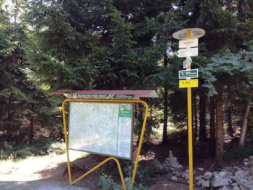 Severovýchodně od vrcholu asi 100 m vzdálený stojí turistický rozcestník na zeleně značené trase Klubu českých turistů, u něho pak malá dřevěná chatka sloužící také jako úkryt před nepřízni počasí.