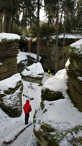 English 🇬🇧: The Pulčín Icefalls are a highlight of the Pulčín-Hradisko National Nature Reserve (NPR). This site is only accessible during the winter months from January to March (1.1. - 31.3.), as access is otherwise prohibited. It represents a natural anomaly, as there is virtually no water here except in winter, when the icefalls are formed from melting snow. Rising warm air melts the snow at the top, which then flows downward and freezes again. The magical coloring of the ice is caused by bacteria living within it. Movement within the NPR is only allowed on marked tourist trails (blue and red). Entry outside these trails is prohibited and may be subject to a fine. This place is definitely...
