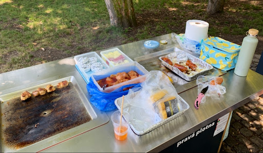 Read moreGriloviště je na super místě a svým způsobem super nápad. Jste ve stromovce, v polostínu pod stromy, jsou tam velké stoly, ke grilu nepotřebujete žádné palivo. Jenomže... Grily jsou tam jenom čtyři a blízko u sebe, což je na takhle vytížené místo dost chabé, a rezervace jsou v sezóně hodně obsazené. Na grily si zvykly místní vosy, které tam mají stálý zdroj jídla a postupem dne jich přibývá tolik, že máte u stolu každý svůj osobní roj, každou chvíli nějakou vytahujete z pití, a riziko že dostanete žihadlo je dost velké. Celé grilování vám nakonec zabije to, že po sobě musíte umýt gril. To sice zní jako samozřejmost a pohoda, než zjistíte, že grilujete na nerezové plotně bez možnosti regulace teploty - tuk se vám na grilu speče do černa a pak hodně štěstí - vezměte si s sebou rovnou soupravu na čištění krbových kamen, protože jinak to nemáte šanci umýt - design grilu je prostě příšerný, a úplně vám to zazdí zážitek z posezení venku - my jsme to tam drhnuli snad půl hodiny, a to jsme měli štěstí, že skupina po nás nepřišla na čas... Za využití grilu platíte 199,- za hodinu, takže za odpoledne u grilu s kamarády dáte jenom za gril a místo u stolu v pohodě 1000,-, protože když si nerezervujete celou dobu posezení, tak vás další parta s rezervací vyhodí... Příště raději využijeme nějaký z volně dostupných grilů na dřevěné uhlí v jiných pražských parcích, které jsou zadarmo, mají klasické rošty, které nemusíte složitě čistit a kde není...