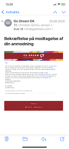 Read moreUalmindelig dĂ„rlig oplevelse med gavekort udstedt af Godream. Gavekortet var inaktivt, da vi skulle bruge det. Har prĂžvet at komme i kontakt med dem pr. telefon og pr. mail uden held. Ăv, det har sgu aldrig vĂŠret mere besvĂŠrligt at gĂžre drĂžmme til virkelighed.