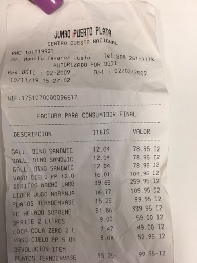 Read moreWent to jumbo for a toaster oven. They were all on the shelves but none were in boxes. I had to wait 15 minutes just to get an employee to tell me that you can not remove the items from the shelf and check out. They have to go get it out of inventory. That requires a phone call, and another 15 minutes just to find out if the product is in stock. This item was out of stock. I was then told I could get the display item. I agreed. They said they would get the box which had the scan code on it that I needed to check out. After another 20 minutes the box arrived. I then asked the employee if I needed to Bring the 20% off sign on the oven to the register. He said no. It is no longer on sale and the sign should have been taken down. But obviouly it was not and I would not have stayed there over an hour to purchase this item. He said he would speak to the manager since the sign was still up, it was a display item and I waited well over an hour. The manager in Puerta Plata could care less that I spent over an hour to buy a falsely advertised out of box item. His response to the on sale sign...."sorry". The manager should be fired. I...