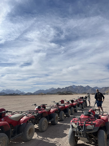 We were picked up by Heba in the afternoon At 13:30 Heba is the Chef of the Team. She told us everything about the tour and spoke english very well. We arrived at the Safari facility were the guides made the quads ready to Start off. We became Googles and instructions to the quads. We drove 25 km threw the Desert to the beduin Village where we became A welcome tea and had enough time to watch around. Next we had a short ride on A Camel After which we came to see how the beduines make their bread and Could Taste it too. After that we had a Lunch what was included in the trip and was stomach friendly and tasty. Altough meanwhile the whole Tour waterbottles were included so we could Drink enough. After the Lunch we went in to the mountains and to the beduines springs. After that we drove Back in the sunset and the guides knew how to make beautiful picture of us in it when we had a stop...