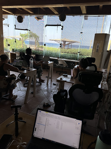 I love this place. Very quiet.usually 10-12 people. The sea at your fingertipps. Restaurant around you. 10 minutes by motorbike to my windsurfing spot. About the internet speed. The landline is not the best. but that doesn't get any better for fixed landlines in Dahab at the moment. If there are more than 10 people in the space. videoconferencing is influenced. But there are no network failures, e.g. VPN is stable. What i do in this case. I use local SIM card from Etisalat and use a mobile hotspot. 8 GB = 10 USD, which is good for 3-4 hours videoconferencing. I see 10 USD per day as a bargain. Opening hours...