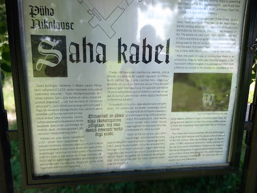 Часовня находится в Харьюмаа, Йыеляхтме в районе деревни Саха,согласно преданиям, часовня была возведена датчанином Никола Туве, Св. Николай Чудотворец является покровителем часовни . 15-ый век Саха-одна из самых старых часовень, которая сохранилась целиком. Она была построенная ещё во времена средневековья. Часовню окружает кладбище, построенное предположительно в 1220 году. К 1223 году относят первые упоминания о кладбище. В средневековье, часовня находилась на попечении церкви Юри, в 16 веке, часовня стала принадлежать церкви Йыэляхтме. Современную часовню построили таллиннские мастера, во второй половине 15 века, по традиции передавать знания из уст в уста, по образу и подобию монастыря Падизе. Двухсводчатая часовня построена из плитняка, она являестя достаточно пропорциональным сооружением. Основной план здания является довольно простым, в северо-западном углу расположена винтовая башенная лестница, на подобие тех, которые строились в больших монастырях и церквях Таллинна. В интерьере также просматриваются таллиннские мотивы. Посреди часовни расположена одиночная арка, которая опирается на длинные плоские консоли. В сводчатых стенах алтаря находятся широкие сегментарные углубления. На западной стене, находится главный портал с однофазным профилем, на южной стене находится боковой портал (рестаур). Около главного портала расположена уникальная ниша, где расположен сосуд с водой, с севера ниши вода утекает через узкий канал часовни. Обе двери снабжены задвижками, при помощи которых двери закрываются, это отдаёт должное защитной функциональности часовни. Для этой часовни характерны узкие длинные окна, их рама выполнена из монополитных плитняковых пластин, это придаёт им архаичный вид. В часовне сохранился плитняковый...