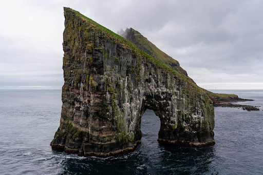 Most people take the hike to Drangarnir and fly their drone to see Tindhólmur, but you can also take long distance photos from across the water on the other side, the road to Gasadular.