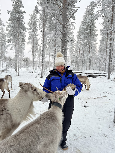 We fed herds of reindeer, saw how well they are treated, loved, and cared for, and how much forest space they have to free roam. These animals are very respected and cared for. After we got to have a good ride around on some snowmobiles which was very fun.