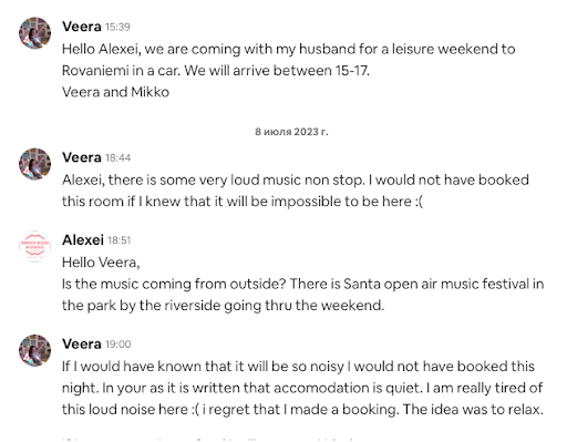 Next reply from host was not apology and problem solving too. It was: ”This is a public outdoor event which have been promoted by the city of Rovaniemi. So it’s a well-known event, which attracts a lot of attention and visitors. We don’t ask our guests why they come to Rovaniemi. I can assume that many of our other guests come specifically because of this festival.”