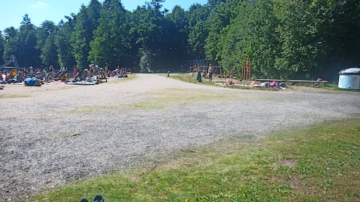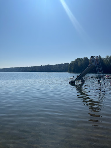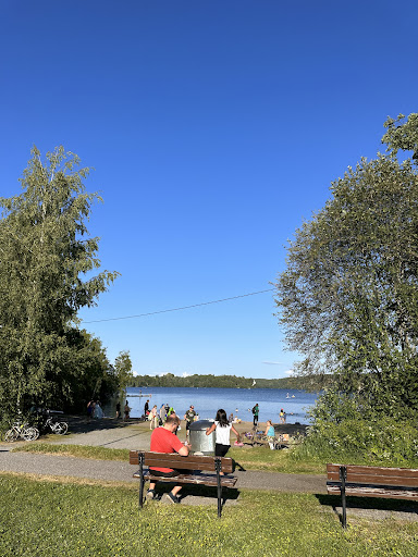 It's a very nice quite small beach with a small sand area but a larger area with grass. Depending on the weather and summer hours you can also rent sup boards, but some desserts like ice cream from a kiosk and even some warm dishes like fries or chicken. Great place for families and friends. One of my favorite beaches to go in the summer. Very cozy.