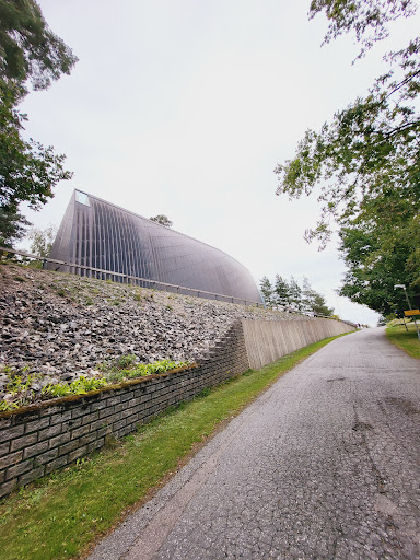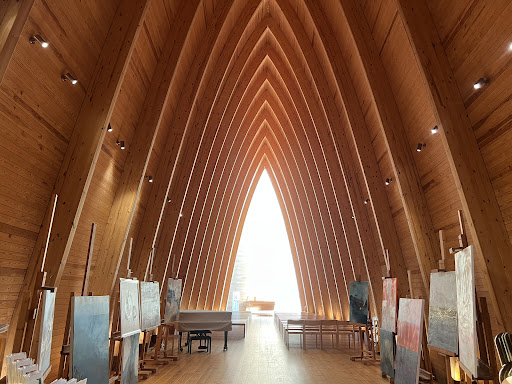Most beautiful chapel!!! Ingeniously planed and designed. A tin shell with delicate touches of glass, blown on a stone hill. Like a giant metal leviathan stuck in a rocks. The entrance through a small triangular facade (like an entrance to a tent) reveals a big stong interior space entirely covered with fragrant and warm solid wood. Wooden ribs create a unique rhythm in the space of the space which is entirely directed to the light. Beauty, spirituality and light!!! warmly...
