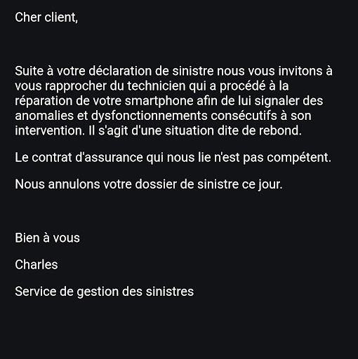 Il y a quelques semaines, j'ai emmené mon téléphone pour un écran fissuré qui a été réparé et j'ai pris l'assurance proposé. Dans le week end je me rends compte que la face arrière n'est plus collé au châssis et que l'appareil photo avant est mort. Je contacte le service réclamation. En 1 semaine et demi, mon écran fissure alors que je suis entrain d'écrire un message (le téléphone n'est pas tombé, n'as pas reçu de coup, rien). Je contacte donc l'assurance : elle ne veut pas prendre en charge l'écran (à 400€) et me dis de retourner en boutique car c'est de leurs ressort.