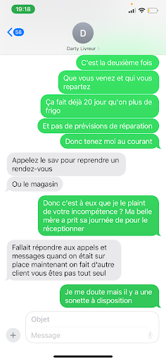 Read moreJe viens pour acheter qqe chose de précis SAMSUNG A9+ pour offrir ! Comme ils ont un prix quasiment identique aux offres sur internet (3€50 de plus!), je prefaire faire travailler un magasin local!!! 1er point négatif 15mn d'attente pour qu'un vendeur soit libre( il n'y en a que 2 pour tout l'établissement - mardi 15 juillet à 11h !!! et on ne peut pas acheter sans un bon établi par le vendeur!!!!) 2 éme point négatif "à titre exceptionnel" il me fait " cadeau" d'un anti-virus, qui en fait est payant au bout d' 1 mois!!!!!! 3 éme point négatif la tablette étant vendue sans le chargeur ( il n'y a que le cordon USB) il me faut un chargeur aux nouvelles normes. Je lui demande la couleur du cordon qui se trouve dans la boîte, il répond " ils sont tous noir, de la couleur de la tablette!", je prend donc un boîtier chargeur noir (logique!). Au déballage de l'appareil, chez moi, le cordon est BLANC?!!?!?! DONC JE ME REROUVE à offrir UNE TABLETTE NOIRE AVEC UN CORDON BLANC ET UN BOITIER CHARGEUR NOIR!!😡 4 éme point négatif, lors de l'achat il me précise qu'elle est vendue avec une housse de protection qui lorsqu'elle est ouverte sert à la positionner droite. Que nenni, aucune housse dans la boîte d'origine lors du déballage ! J'avais déjà eu des déboires avec Darty il y a des années et je n'y étais plus retourné depuis........ben, ce coup ci c'est sûr, je n'y remettrai plus les...