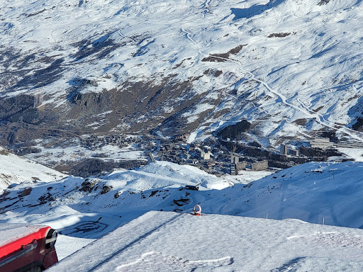 Wonderful panoramic views (even from the toilets!) with a good viewing platform to maximise this. It is also well served by a good quality bar/restaurant, at least when we visited during the ski season. An excellent arrangement of viewing frames helps you appreciate the many surrounding mountains and you also gain a high altitude view of the Les Menuires (the access point by gondola lift) and Val...