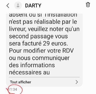 Read moreC'est quoi, cette vendeuse prĂ©nommĂ©e Marie qui, le 22 mars lors de l'achat d'un LL, est avisĂ©e qu'une livraison le 29 mars devra se faire en dehors du crĂ©neau 12h-14h et qu'un SMS sera envoyĂ©e le 28 mars au soir pour prĂ©ciser la tranche horaire ? Le SMS a Ă©tĂ© envoyĂ© le 29 Ă 11h34 pour dire que la livraison sera effectuĂ©e entre 12 et 14h, seul crĂ©neau Ă©videmment incompatible. Cette vendeuse appelĂ©e Ă 11h35 vous dit que la logistique a mandatĂ© le livreur pour 12h15, que tout est ok etc...etc... ProblĂšme, le livreur n'a jamais reçu d'ordre de livrer Ă 12h15 et est donc venu Ă 14h00, soit au bout du bout du crĂ©neau. Heureusement qu'une personne a attendue (et a pu le faire exceptionnellement) de 11h30 Ă 14h pour ĂȘtre prĂ©sente. Sinon, on repartait sur un nouveau RV du mĂȘme genre facturĂ© 29⏠en sus. Ce service de livraison sur RV avec installation est facturĂ© une cinquantaine d'euro, argent encaissĂ© aussitĂŽt mais aprĂšs c'est n'importe quoi. Darty La Teste de Buch, sa vendeuse et sa "logistique" se foutent de qui...